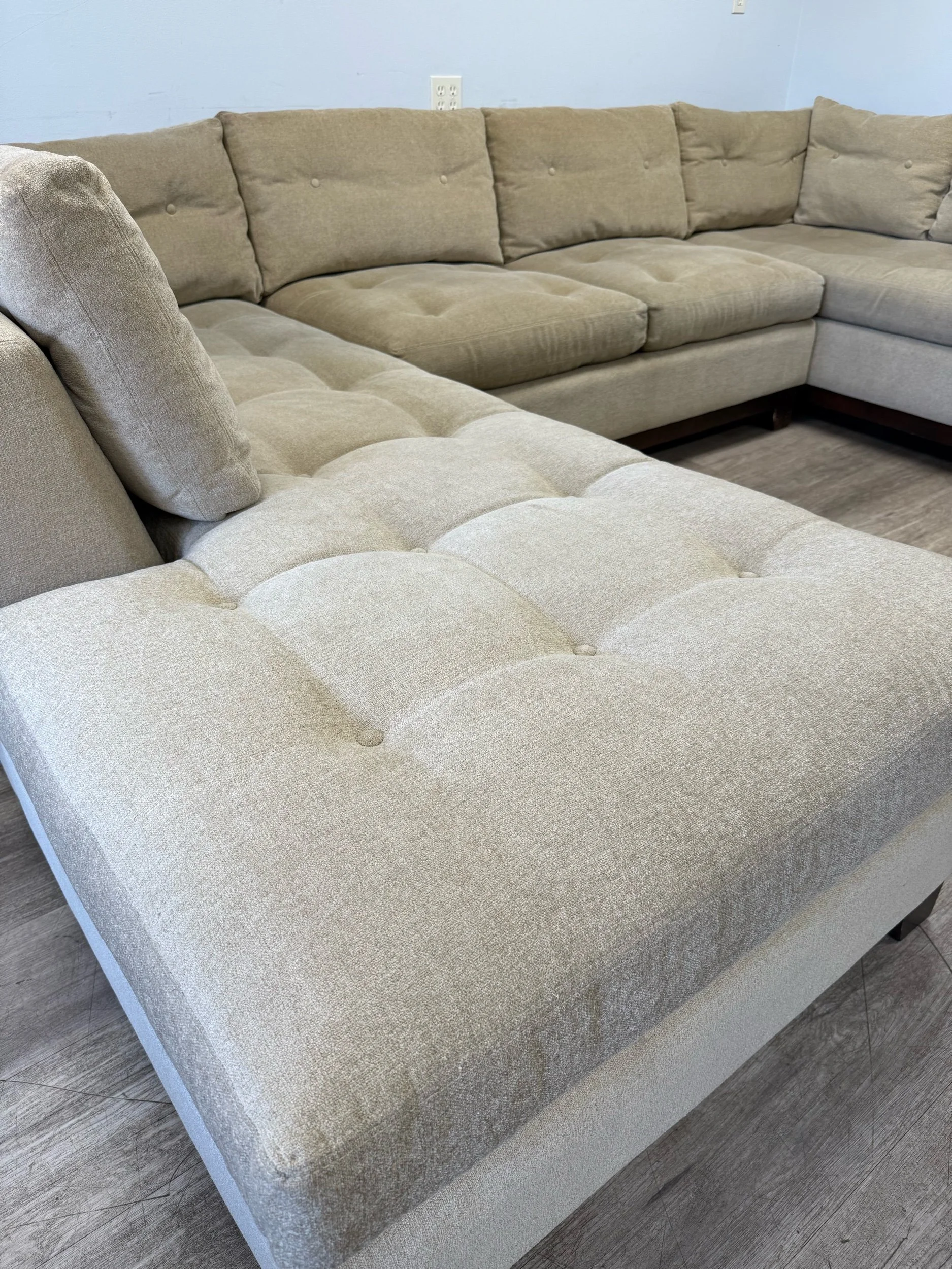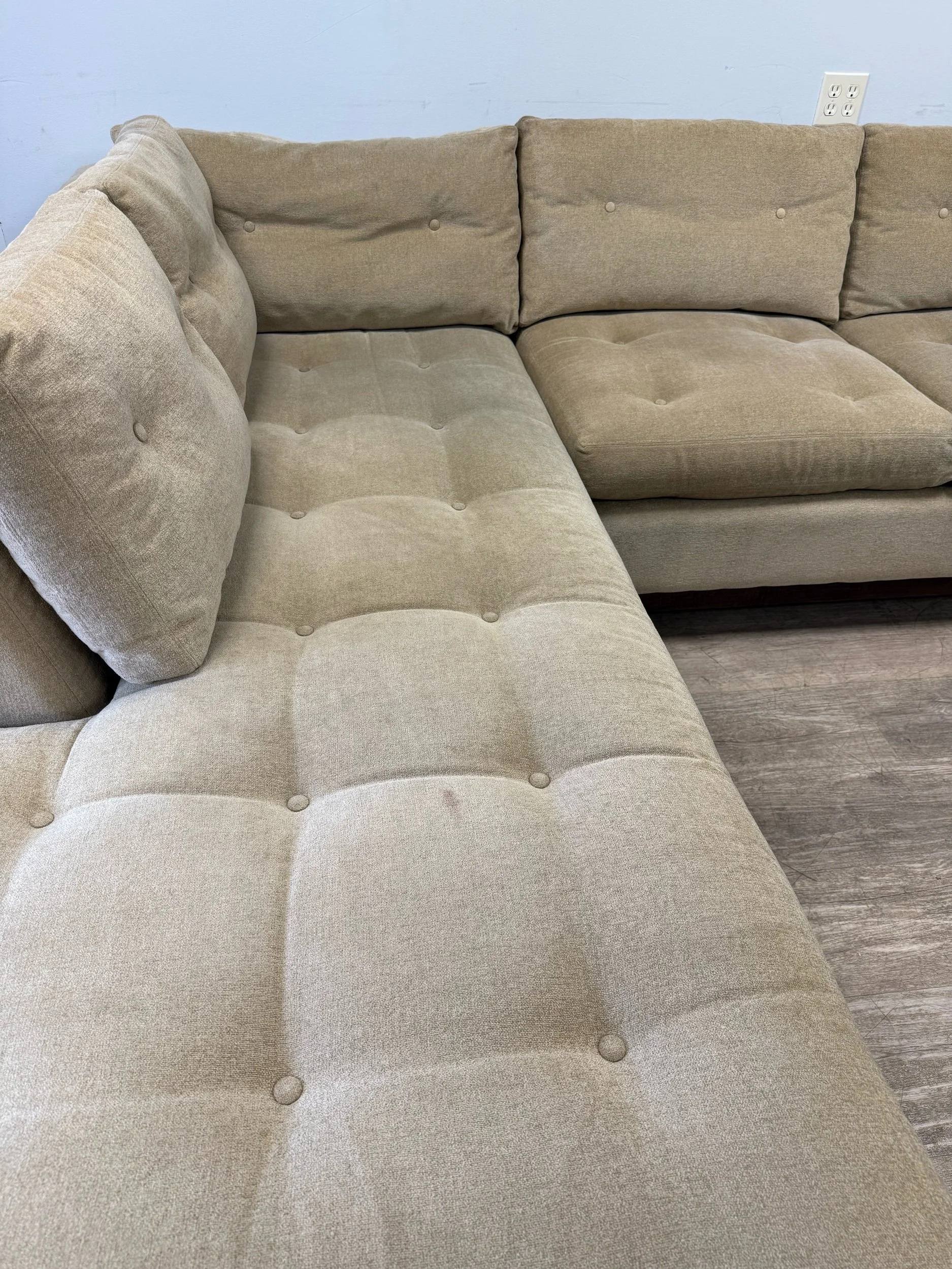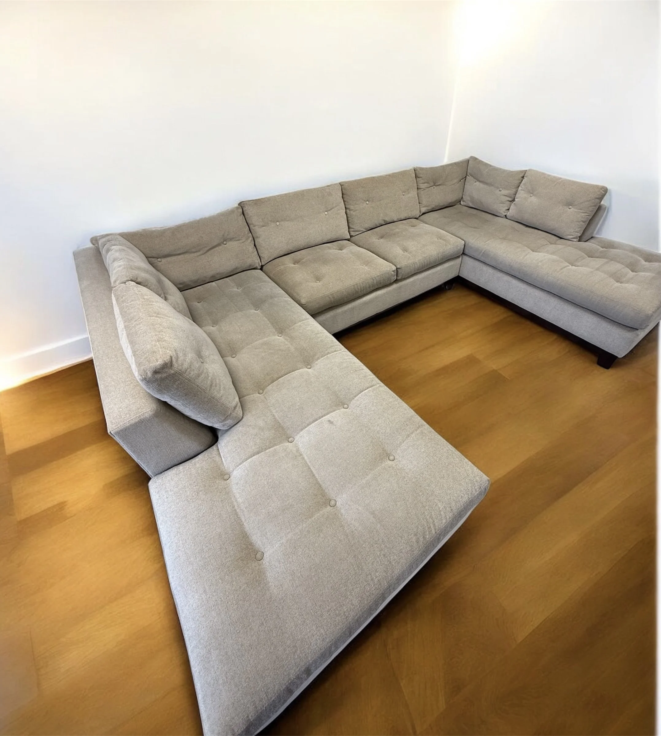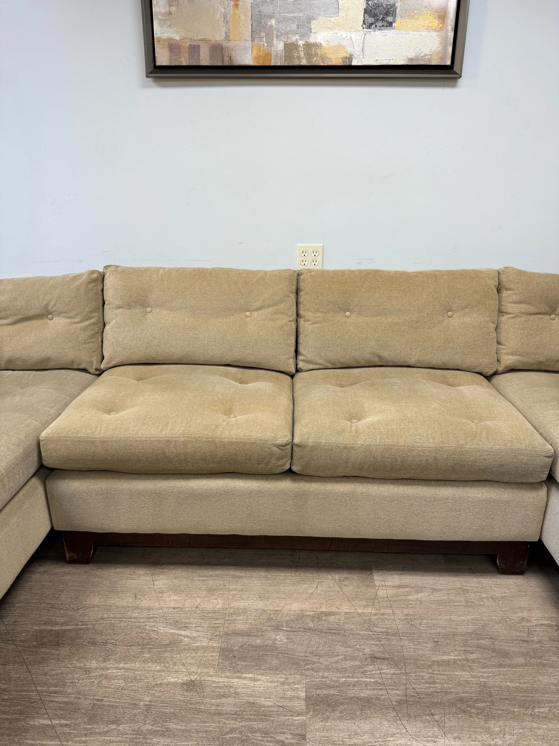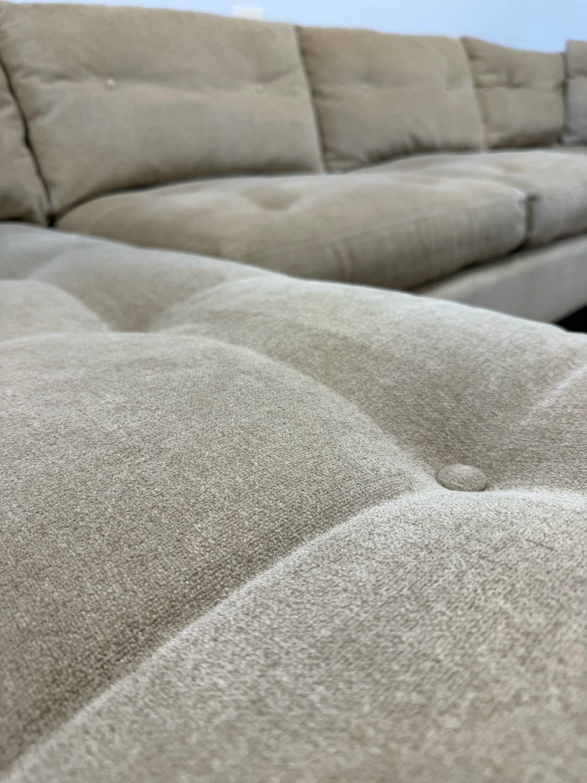 Bring comfort and style together with this spacious modern sectional. Its clean lines, tufted seat cushions, and low-profile design create a relaxed yet refined look that fits beautifully in any home. The soft beige upholstery adds warmth and versatility, while the generously padded seats and back cushions invite you to unwind in comfort.