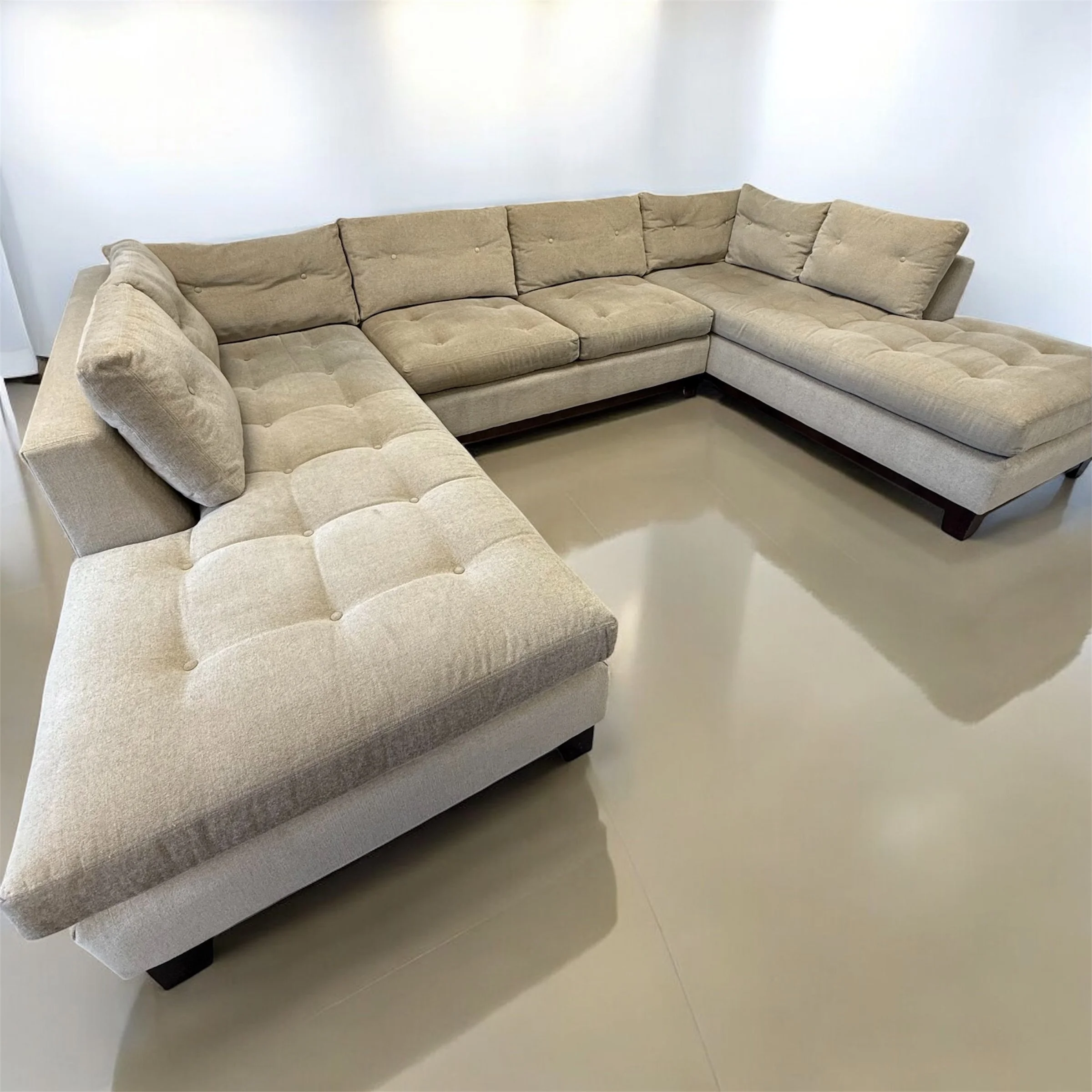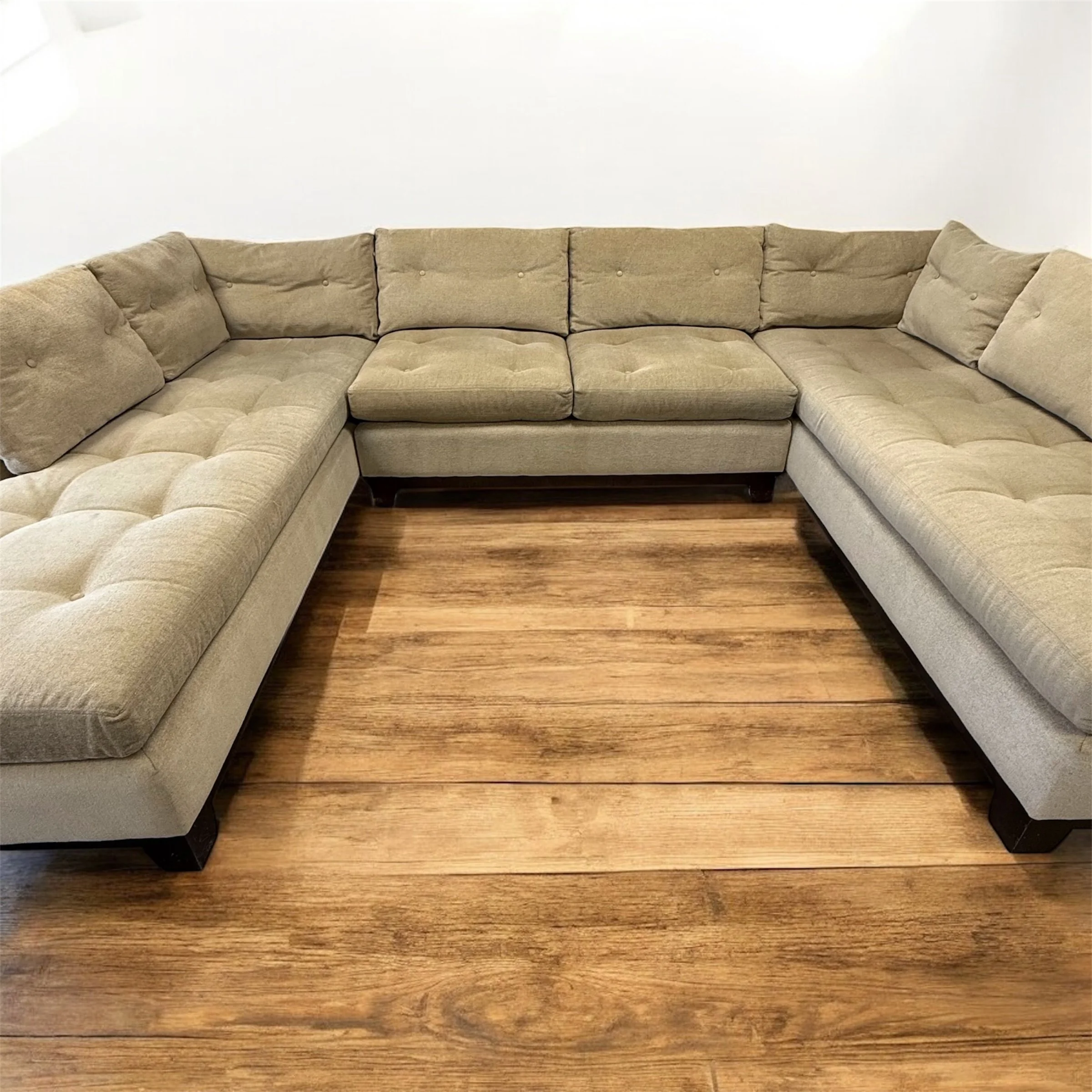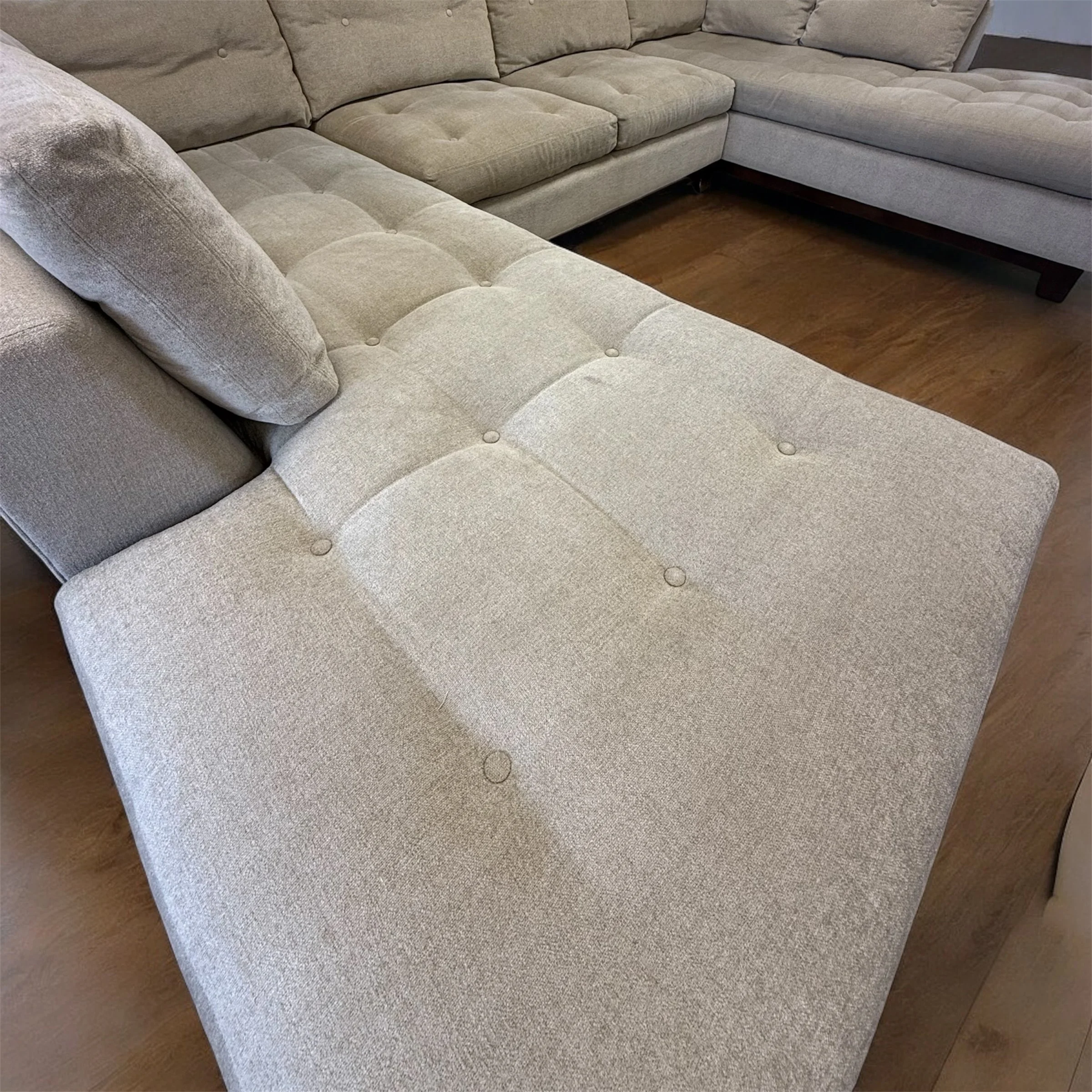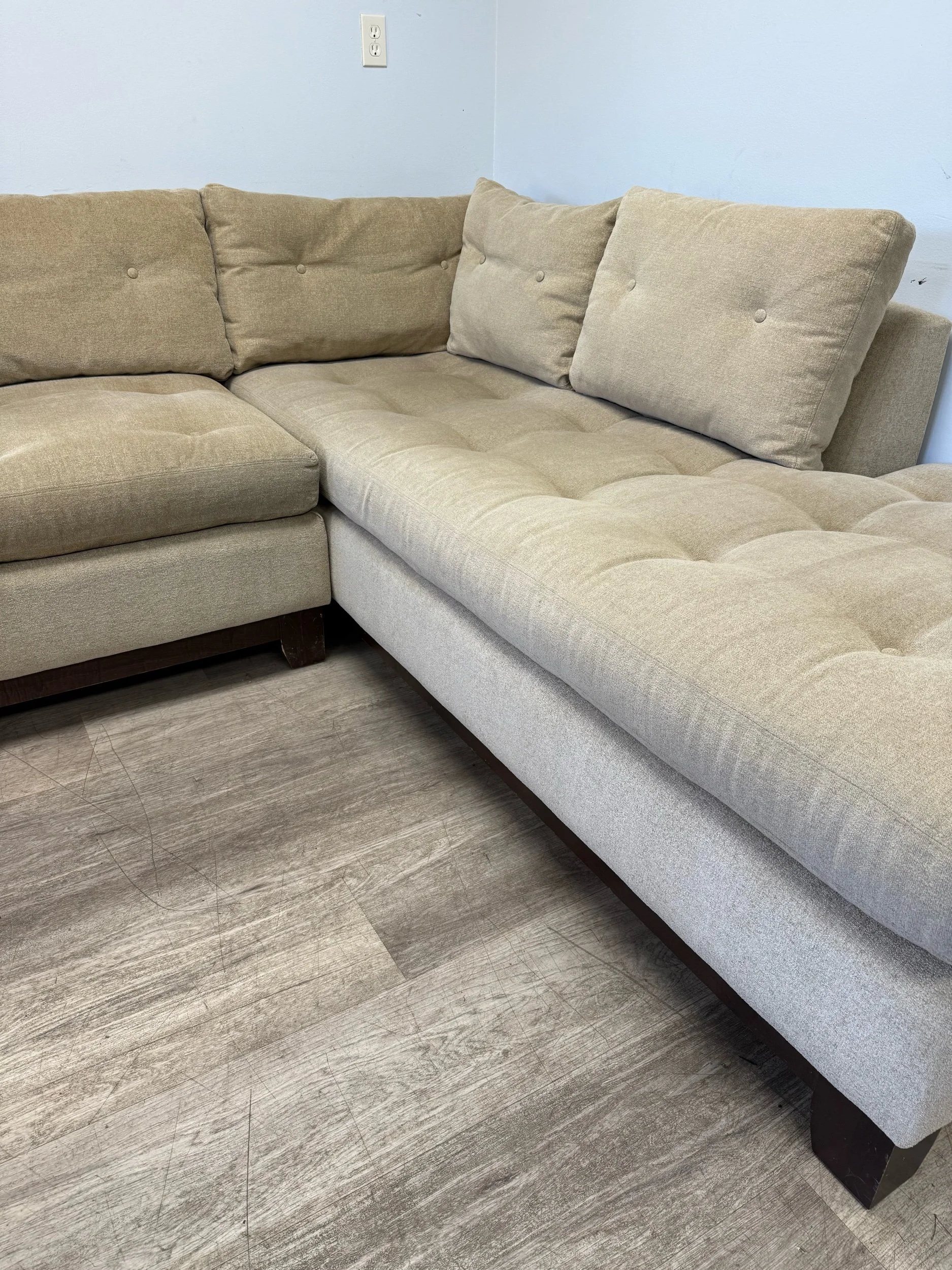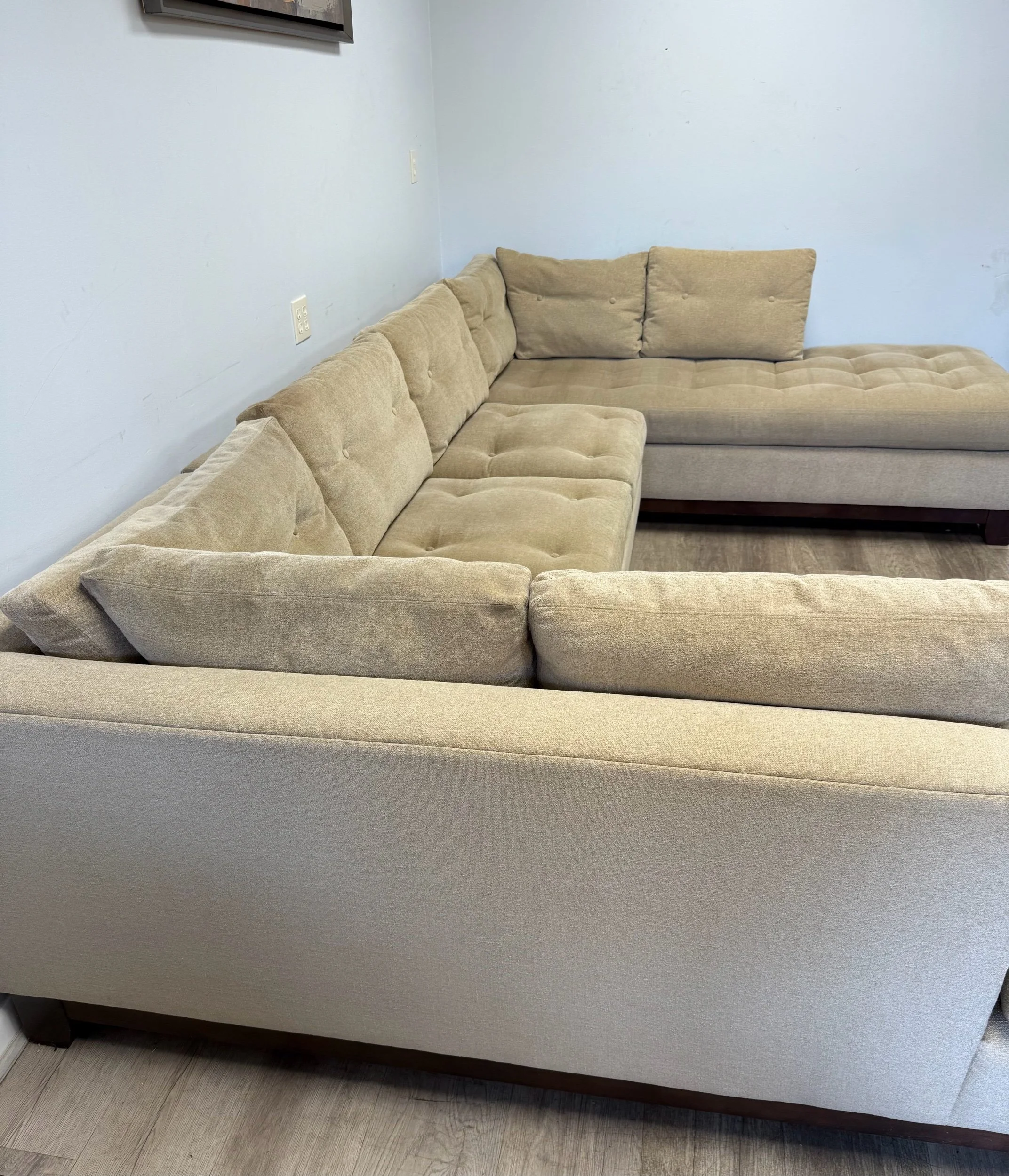 Bring comfort and style together with this spacious modern sectional. Its clean lines, tufted seat cushions, and low-profile design create a relaxed yet refined look that fits beautifully in any home. The soft beige upholstery adds warmth and versatility, while the generously padded seats and back cushions invite you to unwind in comfort.