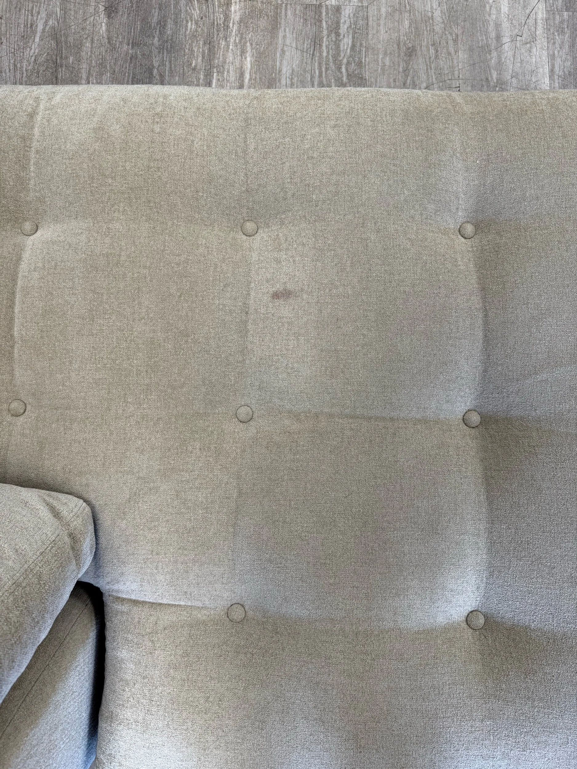 Good condition, normal signs of use. The cushions and frame are sturdy and comfortable. One back cushion is missing two decorative buttons.
