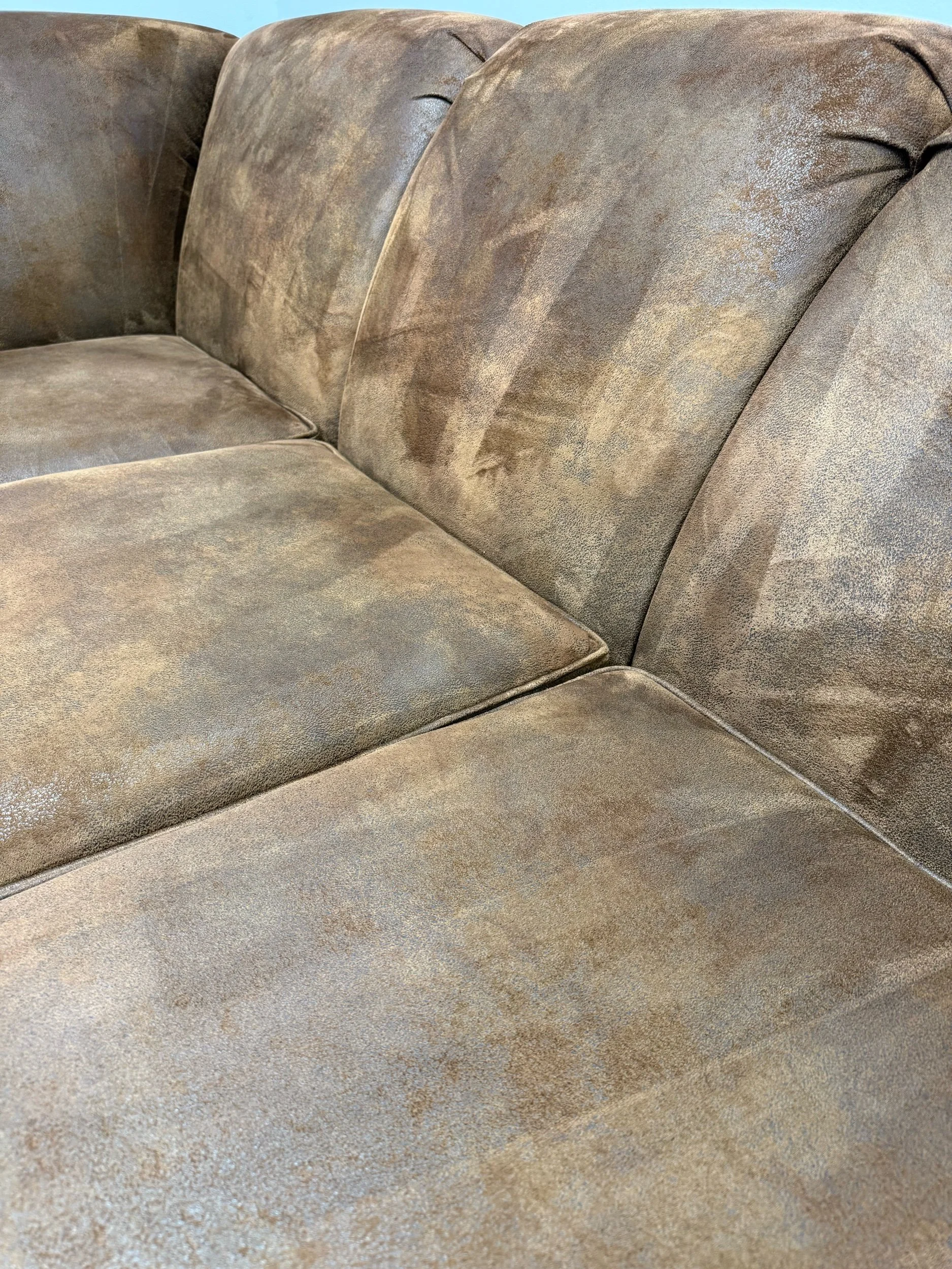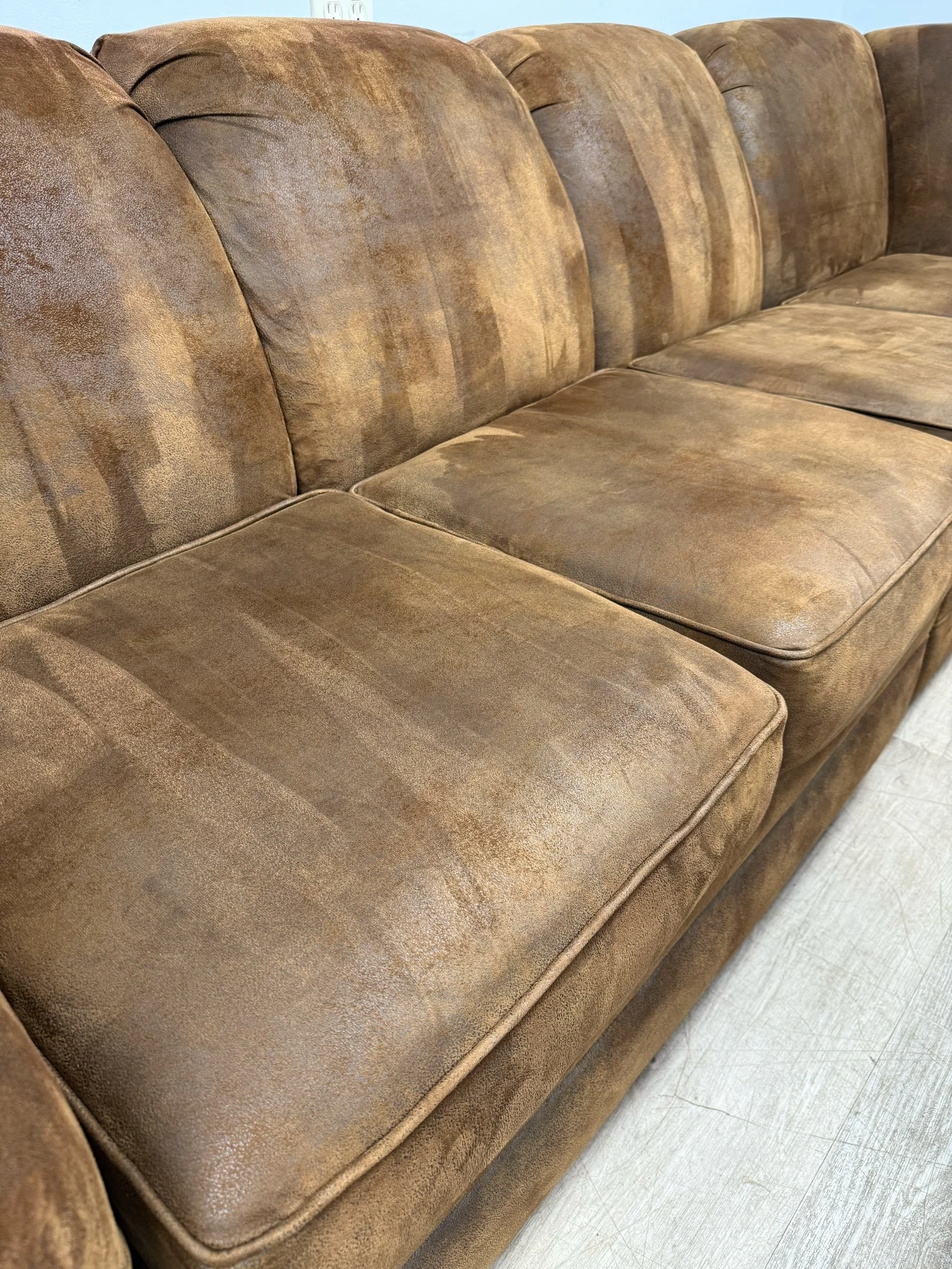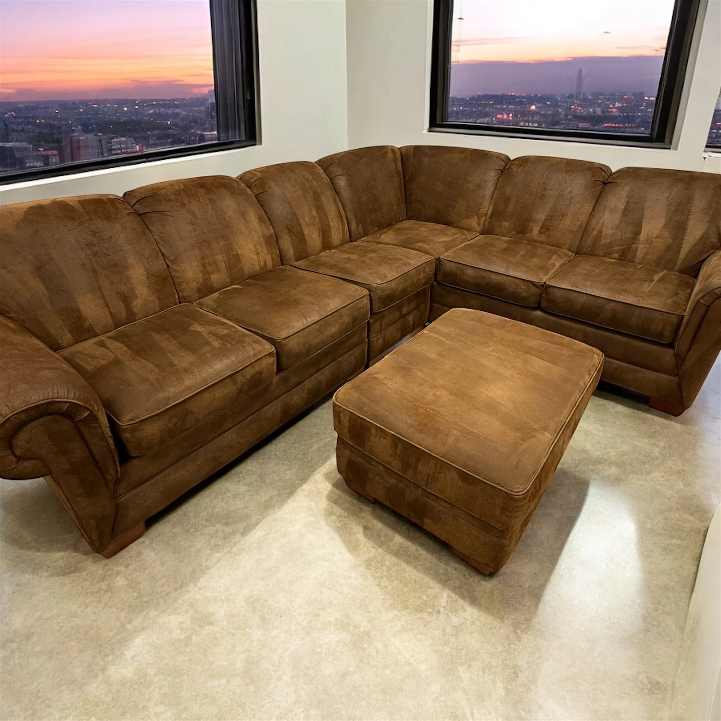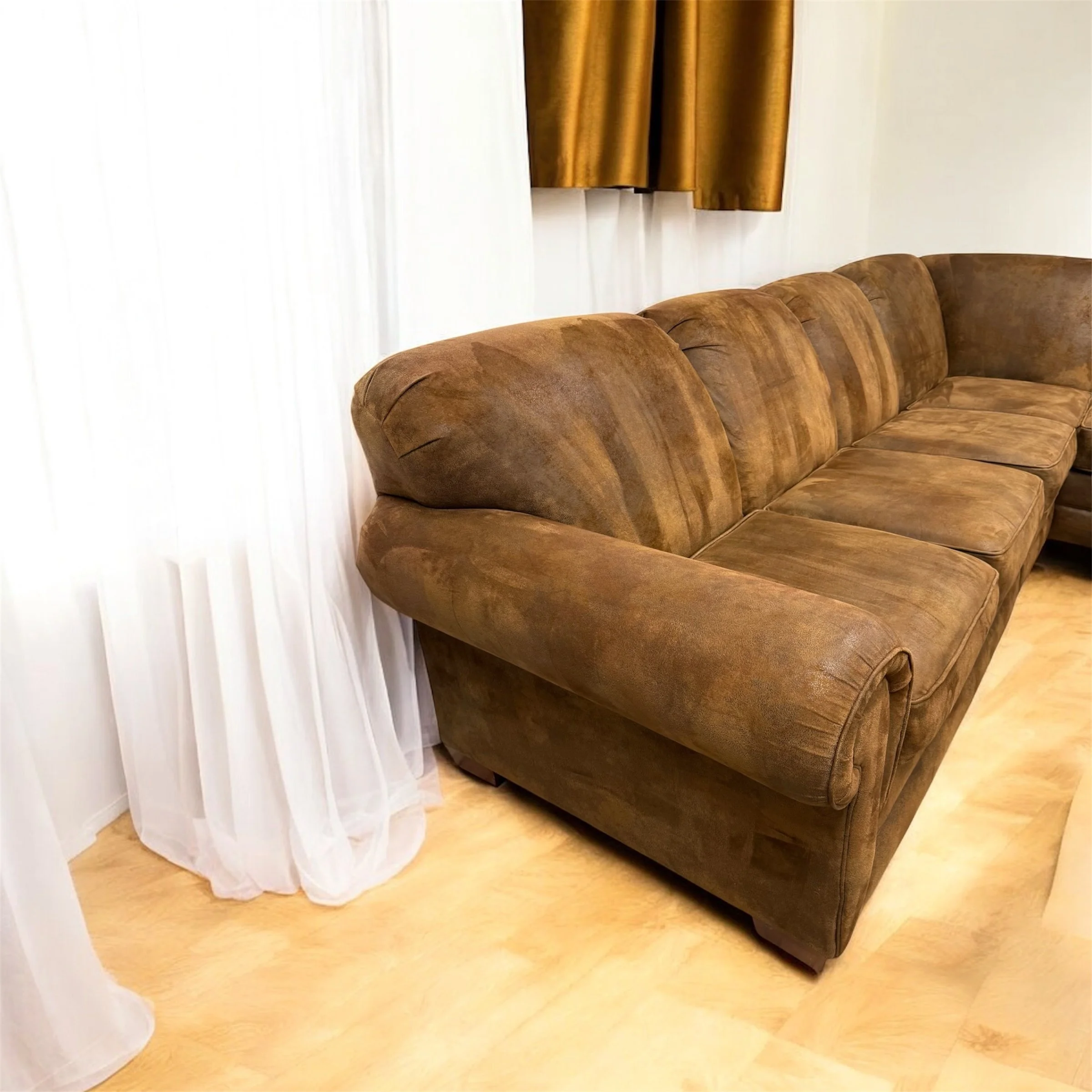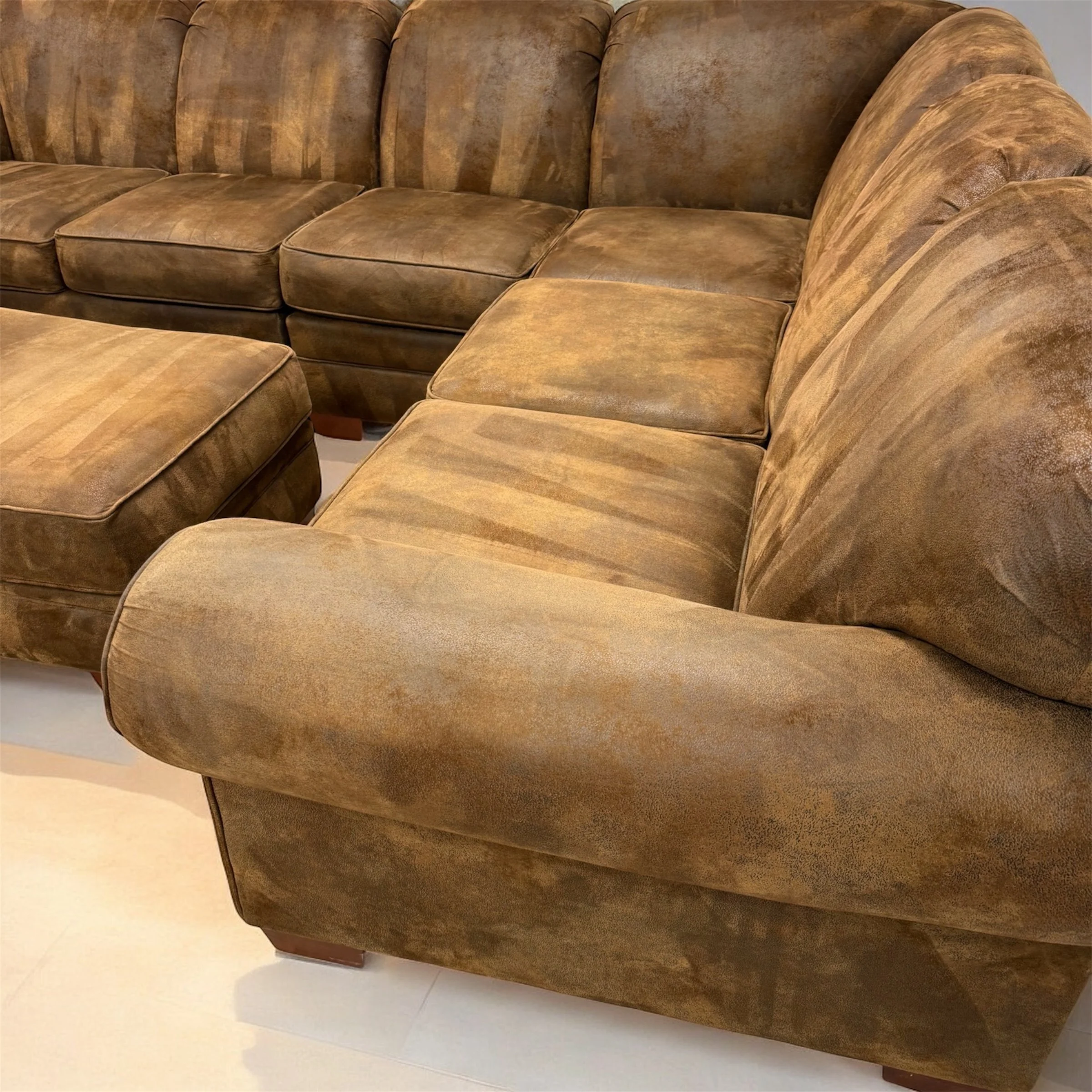 Experience the perfect blend of comfort and style with this unique upholstered leather sectional made by Alpine Furniture. Upholstered in soft, durable fabric, this sofa offers firm cushions for ergonomic support. This sofa is modular, you can customize the layout by making either side longer.